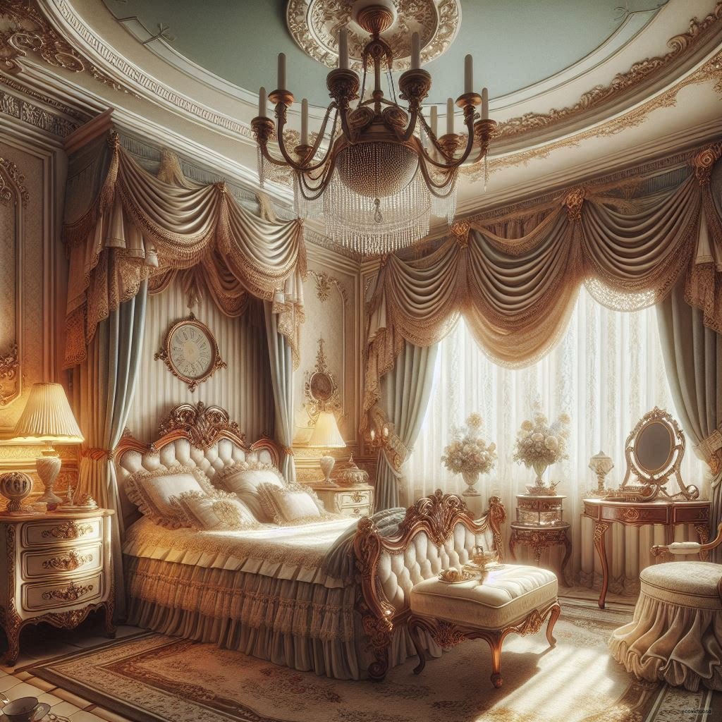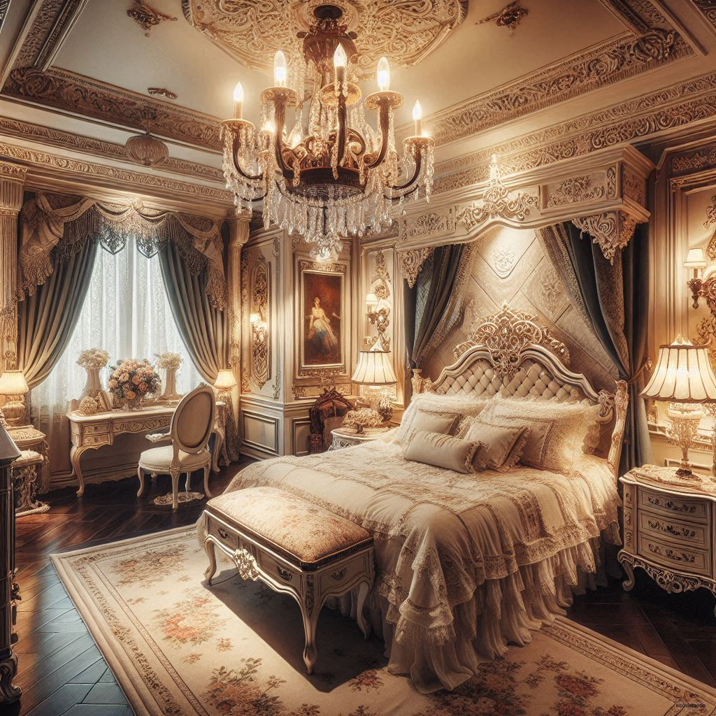 Lighting in a Victorian bedroom should be soft and warm. Think about using a chandelier as the main light source—nothing says Victorian elegance like a crystal chandelier.